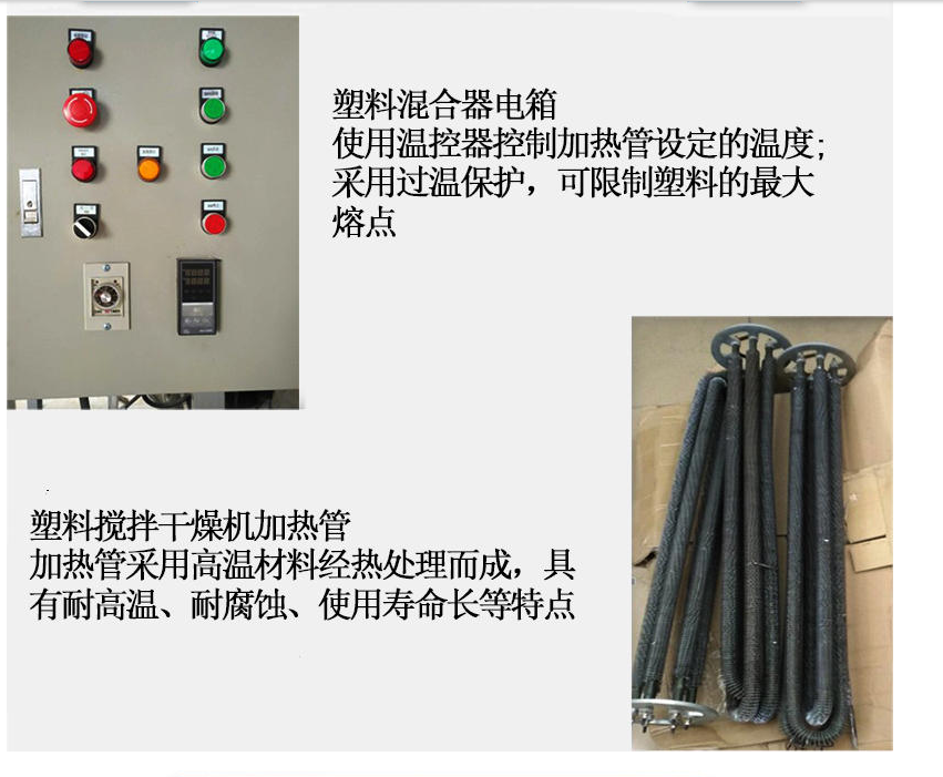 9、干燥混合功能二合一,當不需要干燥時,只需將“加熱開關(guān)及“及風機開關(guān)”關(guān)閉,本系列機型即可用于塑料攪拌均化用途,一機二用。